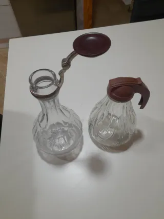 Set di due bottiglie in cristallo con un design vintage. - Bottiglia con tappo metallico e chiusura. 27 cm di altezza - Bottiglia con manico in plastica marrone. 20 cm di altezza