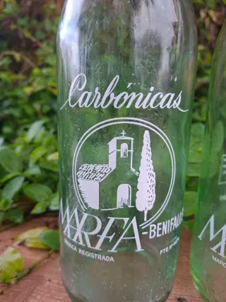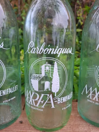 3 vecchie bottiglie di gassosa Marfa. Tutte e 3 sono diverse. Una serigrafata in catalano, l'altra in spagnolo e una con collarino