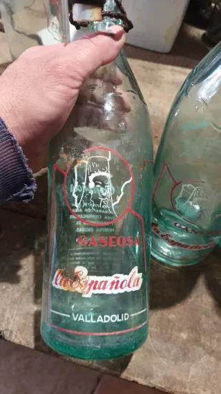 Vecchie bottiglie di vetro di Gaseosa La Española. Ideale per collezioni e decorazioni. Ho altri modelli di bottiglie nel profilo. 15€ l'unità, le bottiglie presentano segni d'uso e macchie, sono bottiglie vecchie non impeccabili. Bottiglie di vetro verde-azzurro. Chiusura ad anello metallico con tappo in ceramica. Etichetta con il nome Gaseosa La Española e Valladolid.