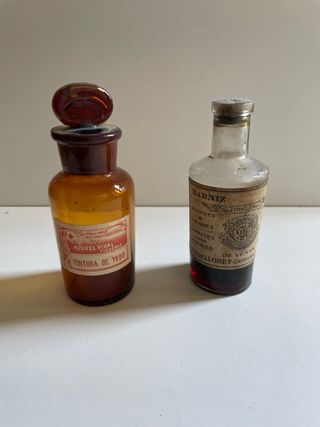 Set di due vecchie bottiglie da farmacia, una in vetro ambra e l'altra trasparente. - Bottiglia in vetro ambra con tappo di vetro. Tintura di iodio Miguel Vidal. - Bottiglia in vetro trasparente con etichetta. Bottiglia Vernice Juan Planella - Entrambe le bottiglie presentano un design classico da farmacia.