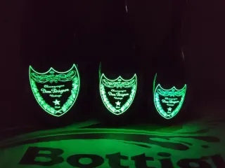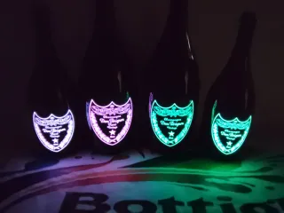 Set di 4 bottiglie Dom Perignon vuote con etichette luminose. 2 magnum da 1, 5 litri e due da 0,75 - Due bottiglie con etichetta luminosa verde. - Due bottiglie con etichetta luminosa rosa.