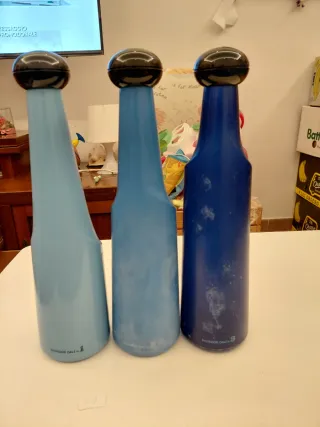 Set di tre bottiglie decorative in plastica blu con tappi neri. Presentano disegni stilizzati in blu scuro. - Bottiglia più alta con disegno di una rosa e vasi. - Bottiglia centrale con disegno di architetture e figure. - Bottiglia più bassa con disegno di architetture e barche.