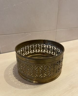 Elegante e fine ciotola antica decorativa in ottone traforato, inizio novecento diam. cm 9,5x h 5. Utilizzabile come Porta bottiglie, porta caramelle o decorazione - Materiale: Ottone - Lavorazione: Traforata