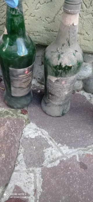 Due bottiglie vuote in vetro, perfette per collezionisti o per decorazione. - Bottiglia verde con etichetta RUSS ANTIC. - Bottiglia verde con tappo rosso e etichetta parzialmente visibile.