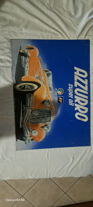 Insegna pubblicitaria vintage per Azzurro Super Oil. - Raffigura un'auto d'epoca arancione. - Sfondo blu con scritte. - Logo IP presente.