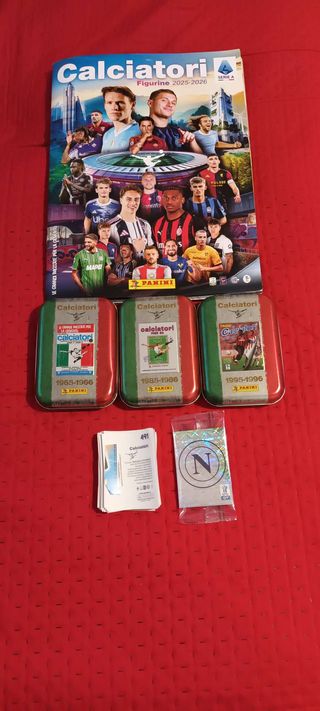 Vendo 35 figurine della nuova collezione calciatori Panini 2025-2026 e latta vuota annata 1995-1996. Visibili dettagli figurine e latta.