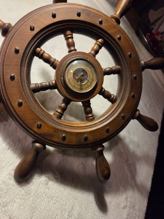 Timone in legno con barometro. Diametro 40 cm oggetto decorativo da appendere o mettere in mostra. Perfetto per arredo di casa al mare, locali di ristorazione al mare o luoghi originali e per aggiungere un tocco marino all'ambiente. Barometro in ottone perfettamente funzionante, epoca anni 70. #timone #mare #vintage #d'epoca Timone in legno con barometro integrato. - Design nautico classico. - Barometro con quadrante dettagliato.