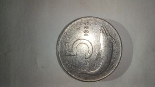 Moneta da 5 Lire del 1954. - Diritto: Effige della Repubblica Italiana. - Rovescio: Delfino stilizzato.