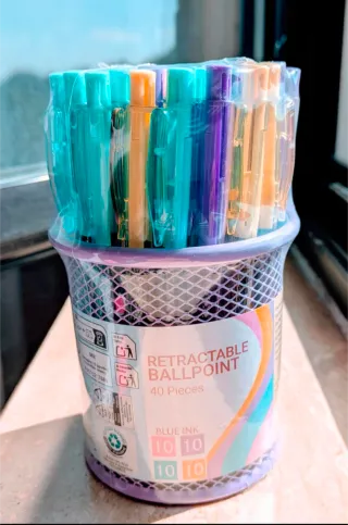 Set di 40 penne a sfera retrattili in colori assortiti, complete di portapenne. 40 pezzi totali. - Penne con inchiostro blu. - Portapenne in rete metallica con finiture viola. 🎁 Perfetto per: Ufficio e Home Office: Per avere sempre una scorta infinita e ordinata. Idea Regalo: Un pensiero utile e colorato per studenti, insegnanti o colleghi. Bomboniere o Gadget: Ottimo per essere diviso in piccoli kit regalo per feste e compleanni. Dettaglio stile: Il portapenne a rete non è solo funzionale, ma aggiunge un tocco moderno e minimalista al tuo spazio di lavoro. Stato: Nuovo, sigillato nella confezione originale.