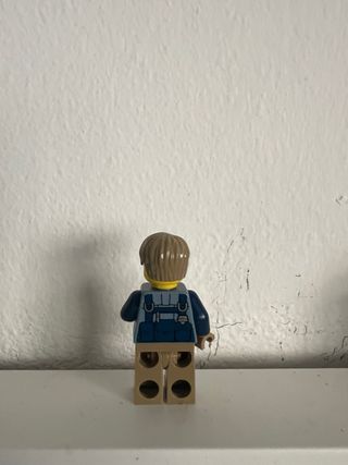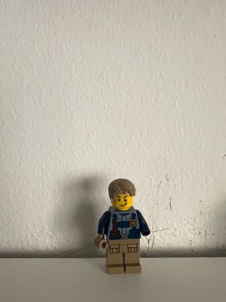 Minifigure Lego di un uomo con uniforme da poliziotto. Chase McCain nel set LEGO City - Testa gialla con espressione sorridente. - Capelli castani. - Gilet tattico blu con distintivo. - Pantaloni beige.