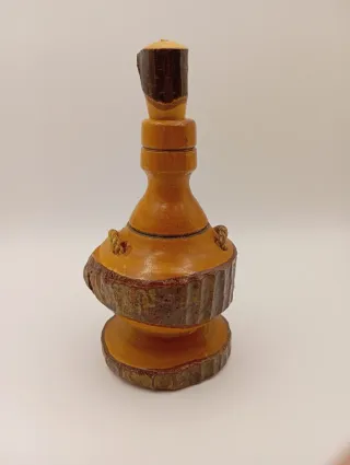 Bottiglia decorativa vintage in legno, anni '70/'80. Realizzata con tecnica che mantiene parte della corteccia naturale per un aspetto rustico, con finiture lucide. Include un tappo in legno coordinato. Presenta piccoli dettagli in corda decorativa. In ottime condizioni