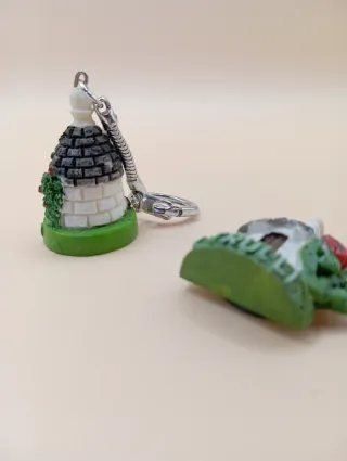 Set di portachiavi e calamita a forma di trullo, uno con la scritta Alberobello e l'altro con Trulli. - Dettagli in rilievo. - Base verde che simula l'erba. - Uno presenta una coccinella e fiori gialli, l'altro un cuore stilizzato sul tetto.