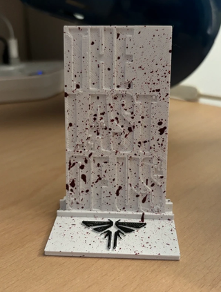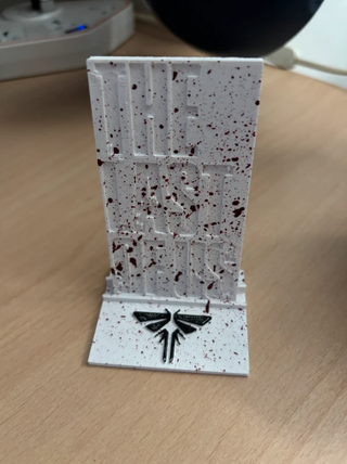 Supporto per telefono ispirato a The Last Of Us, con un design maculato che ricorda il sangue e il logo iconico degli Luci. - Design a tema The Last Of Us. - Dettagli maculati rossi. - Logo Luci applicato. - Materiale PLA