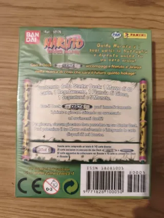 Starter pack del gioco di carte collezionabili Naruto, Serie 5. - Contiene 40 carte. - Include 2 carte olografiche. - Edizione L'eredità del Sogno. - Marchi: Panini, Bandai, Carddass.
