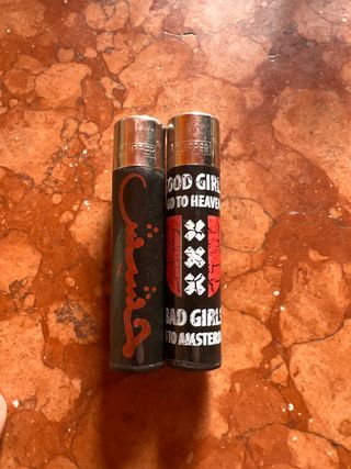 Set di due accendini Clipper con design unici. - Un accendino presenta una grafica con scritte Good Girl Go To Heaven e Bad Girl Go To Amsterdam con i simboli di Amsterdam. - L'altro accendino ha una grafica nera con scritte rosse in arabo.