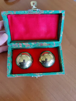 Set di due sfere cinesi in metallo dorato con sonaglio all'interno, per terapia delle mani. Complete di cofanetto decorato. - Cofanetto con interno in tessuto rosso e decorazioni floreali verdi. - Due sfere lisce e lucide.