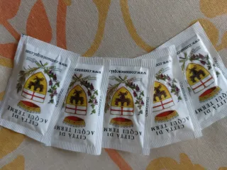 Set di bustine di zucchero da collezione con il logo Città di Acqui Terme. - Logo Città di Acqui Terme presente su ogni bustina. - Decorazione con stemma e elementi floreali.