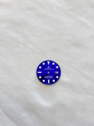 Quadrante blu custom Rolex Submariner. - Logo Rolex. - Scritta OYSTER PERPETUAL DATE. - Scritta SUBMARINER SUPERLATIVE CHRONOMETER OFFICIALLY CERTIFIED. - Scritta SWISS MADE.