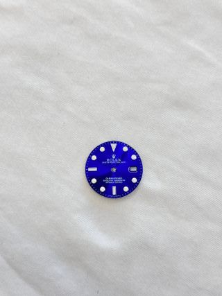 Quadrante blu per Rolex Submariner. Custom - Logo Rolex e scritta OYSTER PERPETUAL DATE. - Indicazioni SUBMARINER, SUPERLATIVE CHRONOMETER, OFFICIALLY CERTIFIED e SWISS MADE.