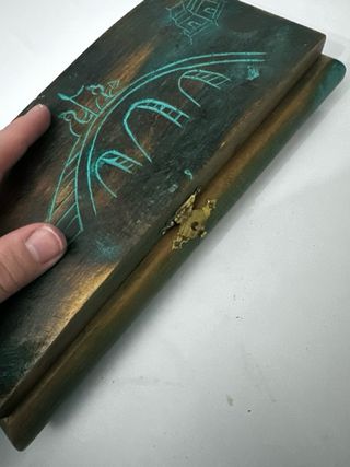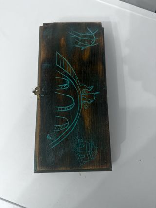 Elegante portagioie antico realizzato in legno scuro con incisioni decorative. - Design unico con motivi incisi. - Chiusura a lucchetto metallica.