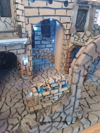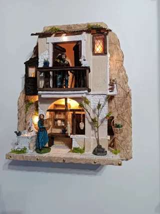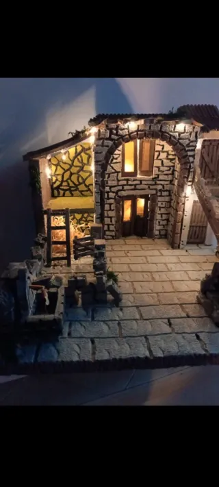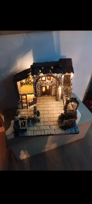 Presepe artigianale in stile napoletano, curato nei dettagli. - Struttura in pietra e mattoni. - Illuminazione a LED integrata. - Arredamento interno dettagliato.