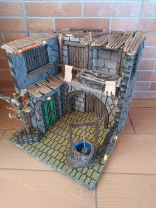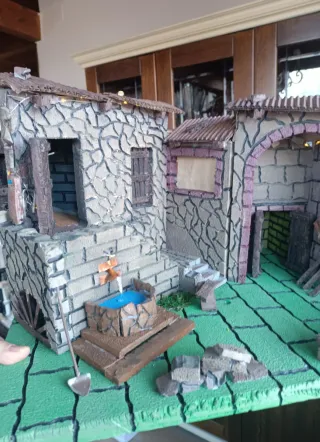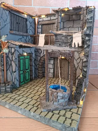 Presepe artigianale in stile napoletano, completo di luci per creare un'atmosfera suggestiva. - Struttura in pietra e legno. - Tetti in lamiera ondulata. - Pozzo centrale. - Porta verde. - Illuminazione integrata.