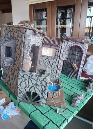 Presepe artigianale in stile napoletano, curato nei dettagli. - Struttura in pietra. - Pozzo con acqua. - Elementi decorativi inclusi.