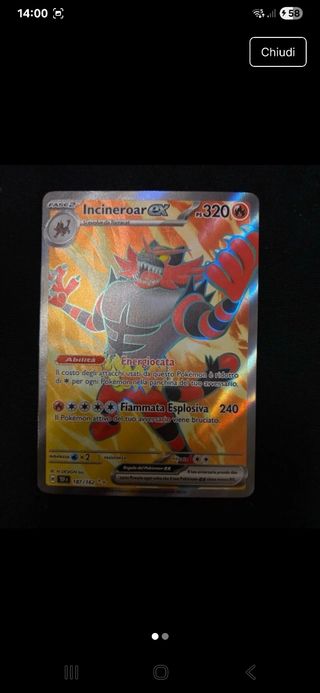 Carta Pokémon Incineroar EX, edizione Full Art. - Numero carta: 187/162 - Fase 2 - Attacco: Fiammata Esplosiva (240 danni) - Abilità: Energiocata