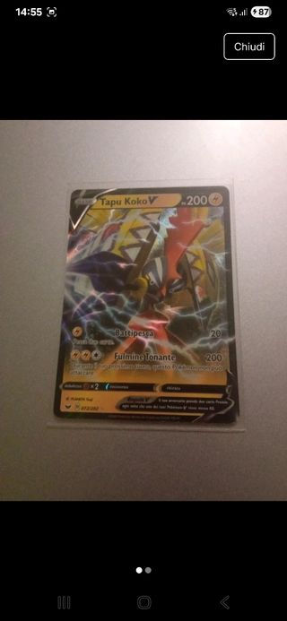 Carta Pokémon Tapu Koko V in ottime condizioni. - Nome: Tapu Koko V - HP: 200 - Attacco: Fulmine Tonante - Numero carta: 072/202 - Set: Pianeta