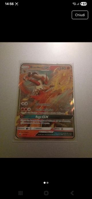 Carta Pokémon Blaziken GX con 240 HP. - Attacco Lacerazione: 60 danni. - Attacco Calcio Atomico: 210 danni. - Attacco Rogo GX: Scarta due Energie assegnate ai Pokémon del tuo avversario. - Debolezza x2. - Resistenza. - Ritirata. - Numero carta: 28/168.