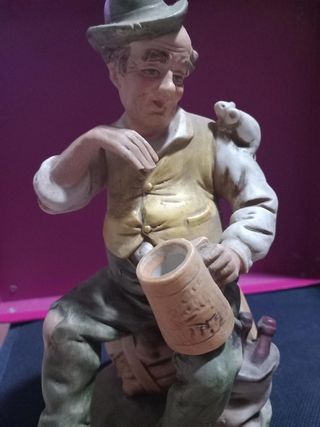 Deliziosa scultura in ceramica raffigurante un uomo con un topo sulla spalla e un boccale in mano. - Dettagli curati. - Pezzo unico decorativo.