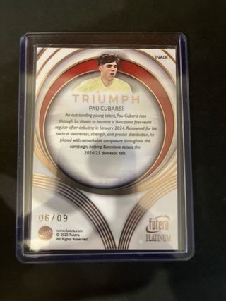 Rara carta de trading Triumph del jugador Pau Cubarsi. - Diseño con detalles dorados. - Número 26 visible en la camiseta.