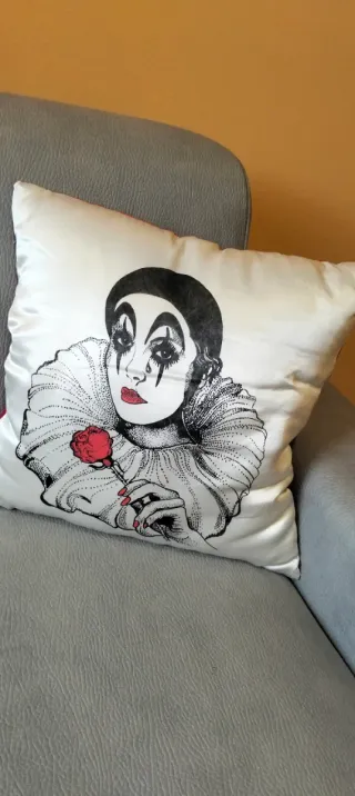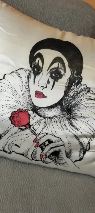 Un cuscino decorativo con un'elegante stampa di Pierrot che tiene una rosa rossa. Aggiunge un tocco artistico e malinconico a qualsiasi ambiente. Fodera in raso - Rosa rossa vibrante tenuta in mano. - Design classico e d'impatto.