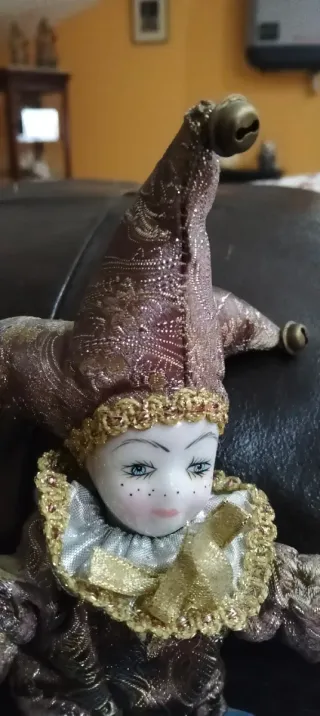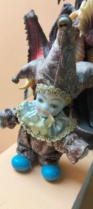 Delizioso giullare in porcellana, con un vestito colorato e dettagli curati. - Realizzato in porcellana. - Abito con cappello a punta e campanelli - Piedi azzurri come gli occhi🩵 - Viso dipinto a mano con lentiggini.