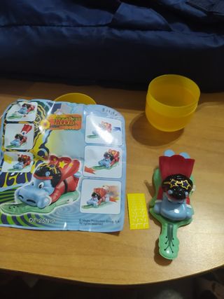 Sorpresina Kinder con un simpatico ippopotamo che cavalca una tavola. - Personaggio con mantello rosso e stelle dorate. - Tavola verde con decorazioni. - Include foglietto illustrativo. DE-25-N-2 completo