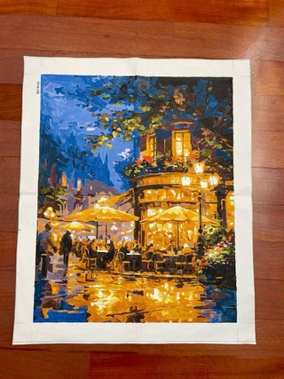 Quadro Paint by Numbers raffigurante un caffè parigino di notte, con luci calde e riflessi sull'asfalto bagnato. Un'opera d'arte creata da te. - Tela dipinta a mano con tecnica Paint by Numbers. - Scena notturna di un caffè con tavolini all'aperto. - Atmosfera suggestiva con luci gialle e blu intenso.