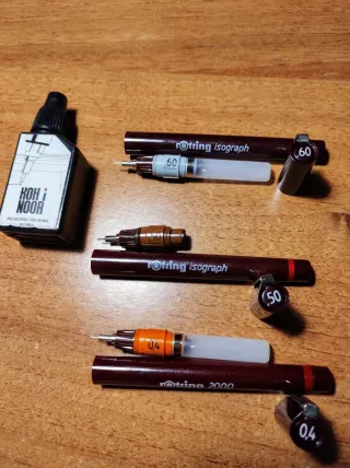 Vendo penne a china professionali Rotring e Koh-I-Noor per architetti e ingegneri. Rotring 0,60 mm Rotring 0,50 mm Rotring 0,40 mm Koh-I-Noor 0,3 mm Koh-I-Noor 0,2 mm Come nuove. Usata solo una volta la Koh-I-Noor 0,2 mm. Le Rotring hanno il serbatoio intercambiabile da riempire con l'apposito inchiostro. Le Koh-I-Noor hanno il foro di ricarica per riempire il serbatoio con apposite istruzioni. Allego foto abbastanza esplicative. In regalo l'inchiostro