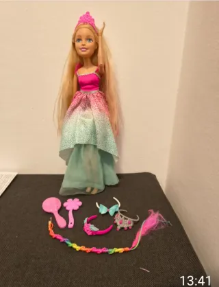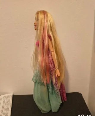 Bambola Barbie capelli arcobaleno Mattel 2015, come in foto. - Capelli con sfumature blu, rosa e bianche. - Vestito argento scintillante. - Orecchini viola.