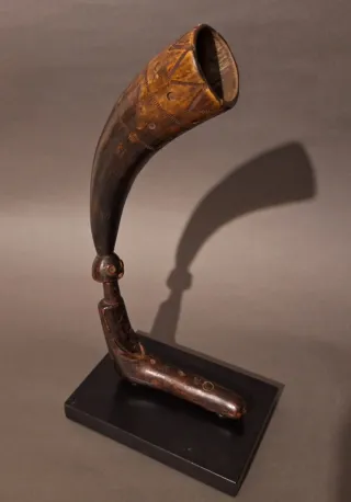 Fischietto tradizionale africano, proveniente dalla regione Mossi del Burkina Faso. Un pezzo unico con un design distintivo. - Realizzato in legno. - Decorazioni incise sul corpo. H 41 cm. Bella patina. Già montato su piedistallo in metallo