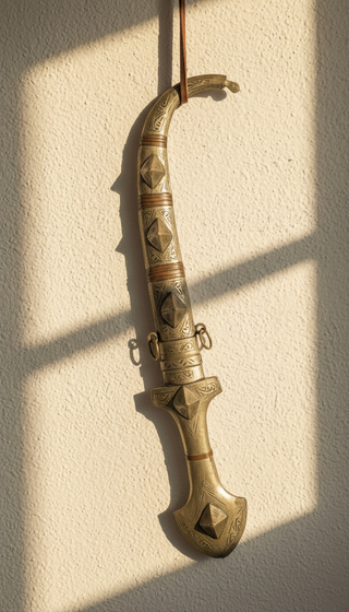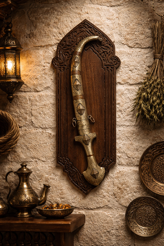 Bellissimo pugnale decorativo orientale, realizzato in ottone con incisioni dettagliate. Un pezzo unico che aggiunge un tocco di eleganza. - Materiale: Ottone - Decorazioni: Incisioni orientali - Lunghezza: 32 cm Pugnale decorativo da collezione con fodero ricurvo in ottone inciso a mano, arricchito da motivi geometrici in rilievo e finiture color bronzo; lunghezza totale circa 32 cm, spessore dell’impugnatura circa 3–4 cm. Ideale come oggetto d’arredo etnico o regalo di Capodanno, può essere esposto su mensole o appeso grazie agli anelli laterali, aggiungendo un tocco di fascino orientale e artigianale a qualsiasi ambiente.