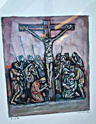 Quadro religioso Crocifissione del pittore Morelli. Stampa artistica a tema religioso firmata Morelli, raffigurante la scena della Crocifissione con figure stilizzate e colori intensi, completa di passepartout chiaro e cornice in legno scuro in buone condizioni. Ideale per collezionisti di arte sacra o per arredare casa con un tocco classico, il vetro è integro e il quadro è pronto da appendere. - Opera d'arte a tema religioso. - Firma dell'artista visibile.