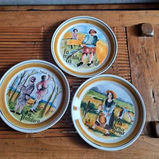 Bellissimo set di tre piatti in ceramica di Bassano, finemente dipinti a mano con scene di vita contadina. - Ceramica di Bassano - Dipinti a mano - Scene di vita contadina