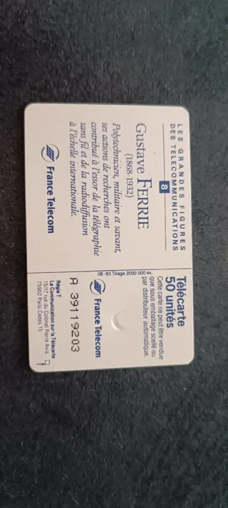 Telecarte francese da collezione, serie Les Grandes Figures des Télécommunications, 1993 - Tiratura: 2.000.000 esemplari. - Produttore: France Telecom. - Codice: B36028036.