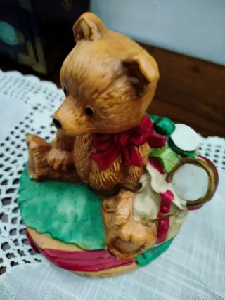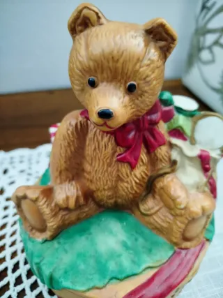 Carillon a forma di orsetto con un fiocco rosso al collo, seduto su una base decorata con doni. Funzionante: caricandolo suona una dolce musica natalizia - Orsetto in ceramica color miele. - Fiocco rosso in tessuto. - Base decorata con pacchi regalo.