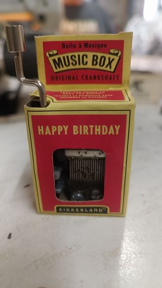 Carillon a manovella a tema Happy Birthday. - Scatola musicale vintage. - Design con scritta Happy Birthday. - Meccanismo a manovella originale. - Marchio Kikkerland.misura 8x5