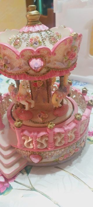 Bellissimo carillon musicale a forma di giostra, con dettagli rosa e cavalli bianchi. Perfetto per decorare una cameretta o come regalo. - Giostra rotante - Cavalli bianchi - Dettagli rosa e glitterati - Realizzato in resina