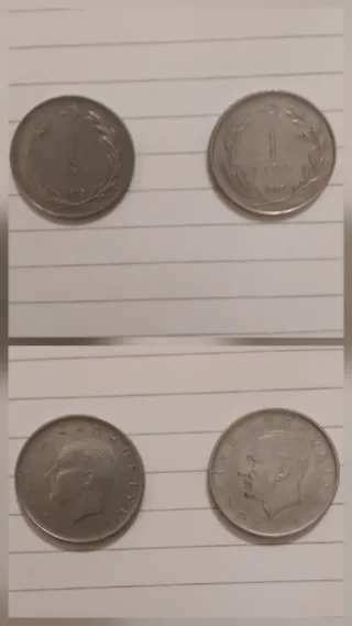 Due monete turche da 1 Lira, coniate nel 1970. Rappresentano un simbolo di collezionismo numismatico. - Dritto: Ritratto di Atatürk. - Rovescio: Simbolo della mezzaluna e stella con spighe di grano.