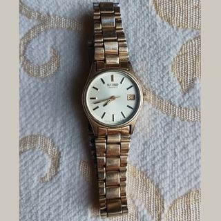 Orologio da donna Seiko Quartz, movimento al quarzo, con datario. Cinturino in metallo, chiusura a scatto, quadrante fondo chiaro, cassa in acciaio, corona, fondello a pressione. Usato, in ottimo stato, perfettamente funzionante.