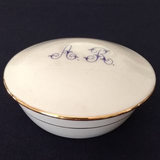 Bomboniera in fine ceramica con iniziali A.R. sul coperchio. In perfette condizioni. Vintage anni '70 Dimensioni: 11 x 11 x 4,5 cm. circa Peso: 180 gr. Ideale per collezionisti o piccolo portagioie.