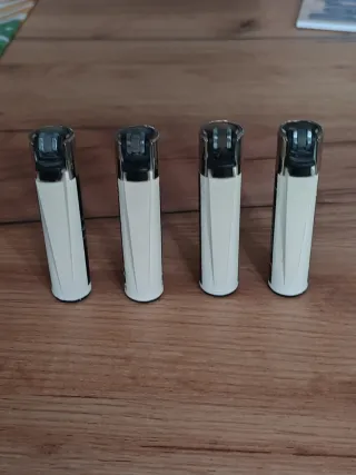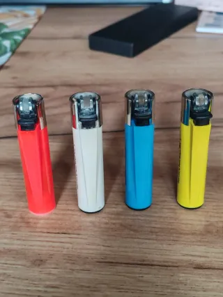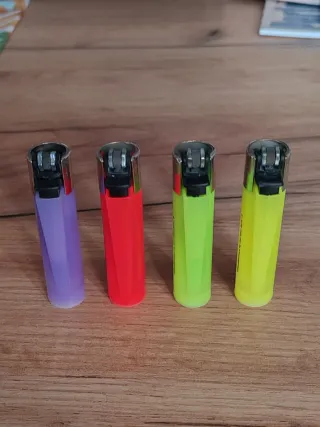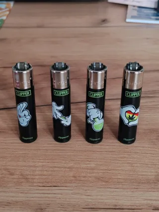 Set di 4 accendini Clipper da collezione israeliani - Accendino rosso con disegno 4:20 e foglia di marijuana. - Accendino bianco con cuori e disegno LOVE. - Accendino blu con funghi e scritta LIFE. - Accendino giallo con disegno PUFF e simbolo.